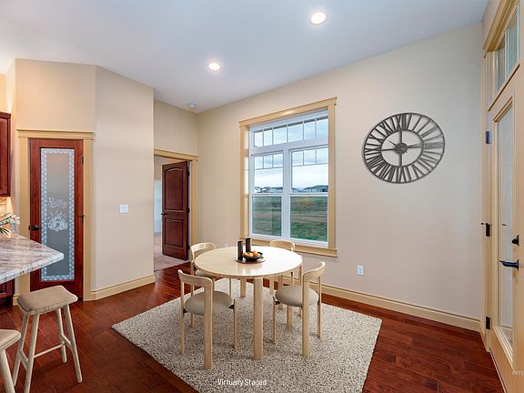 Just completed one level with bonus room and three car garage! Thoughtful touches in this brand new 3 bedroom, 2.5 bath one level in a new subdivision. Granite counters, cherry cabinets and solid fir doors throughout, engineered hardwood floors, tankless gas water heater, salt-free water filtration system, finished oversize garage with cabinets, counter and finished storage space. Wood fireplace with gas ignitor. Wide open views of the hills and rolling fields to enjoy from every window, the covered patio and front porch with wooden swing. Covered back patio is heated, plumbed for gas barbecue and TV. Over 4 acres provides room for a shop or stable to house horses. Exquisite build by Curt Helsor, this home is a show stopper! *Home was recently finished and taxes do not reflect the improved assessment yet. Occupancy permit was issued May 2023.