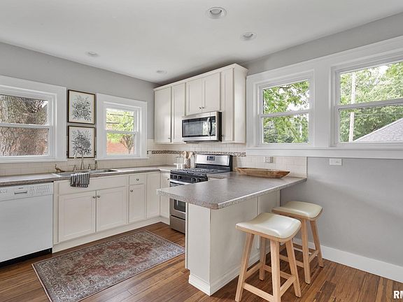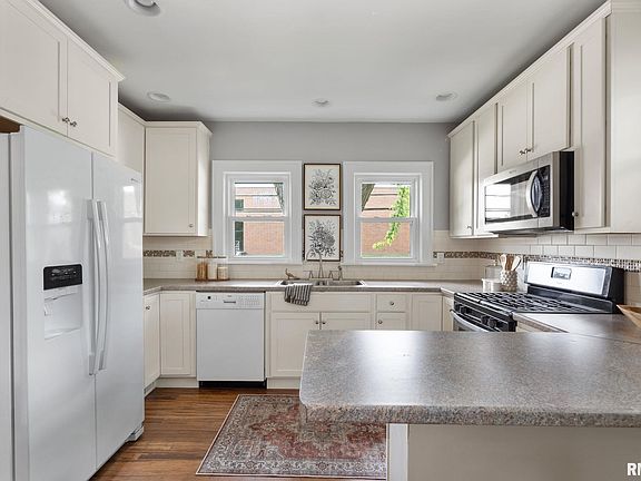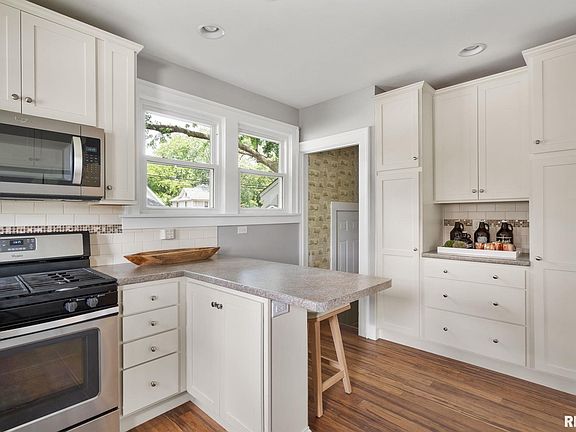 The perfect mix of modern updates & original charm! Beautiful hardwood floors, and trim. Large living room with wood burning fireplace. Remodeled kitchen with new cabinets, countertops, and backsplash. Formal dining room. Main level primary bedroom & updated full bathroom with nice tile shower. Two additional bedrooms with large closets upstairs, along with additional unfinished attic space. 1 car garage. Directly across from Saint Ambrose University, you will love the convenient location close to Vandeveer Park, shopping, and schools!