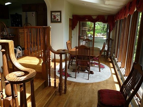 Fantastic opportunity to live in a private park-like setting. House on hilltop overlooks beautiful landscape: trees, gardens, stocked fish pond and in-ground pool. Four out-buildings offer opportunity for multiple uses: Guest House/Office w/bath 38x26 suitable for In-law suite; detached Game/Play Room (heat/air) 21x19; Work Room16x16; Barn 50x30 for additional cars boat,equipment. Screened in Gazebo. Zoned for animal