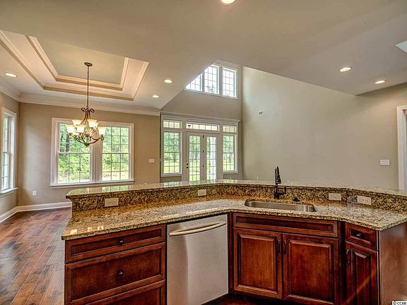 This custom built move in ready home boast 2700 heated square feet and 3600 total square feet. Coffered ceilings in the master bedroom and huge open living area will make the new owner of this home very happy. The two story great room with French doors will allow tons of natural light in the home. The expansive master suite has a large walk-in closet and a 5.5 x 4.5 walk-in shower. The other first floor bedroom could double as an office or den and has access to its own bathroom. The upstairs has three large bedrooms, 2 bathrooms and a balcony looking into the two story great room. Granite countertops, custom cabinets, and stainless steel appliances are a few more features. Waterbridge of Carolina Forest in Myrtle Beach is one of the newest subdivisions in the Grand Strand real estate market. This neighborhood has a resort style theme and homes here have a style that’s similar to coastal cottages. Although Waterbridge has a casual feel, the homes here offer elegant, upmarket construction features and amenities. With over 80 residential homesites sold in 2013 Waterbridge is a community on the move. There is a sixty-acre lake and over twenty acres of nature preserve. Some of the amenities offered to residents are: Village style clubhouse, Resort-style swimming pool, Walking trails, Fire pit, 60 plus acre Palmetto Lake, Fitness center, Nature pocket parks, Small vessel boat storage, Sand volleyball, Two tennis courts, Intracoastal Waterway Access, Beach Access, and more! Waterbridge is the perfect neighborhood for people looking buy Myrtle Beach real estate and enjoy the beach lifestyle without the tourist traffic, crowds and congestion of the downtown area. Residents can come home to much of the same activities without all the hassle. Carolina Forest has a wealth of fine restaurants and casual dining options. Nearby shops, grocery stores, medical services and award winning schools complement the amenities of Waterbridge.