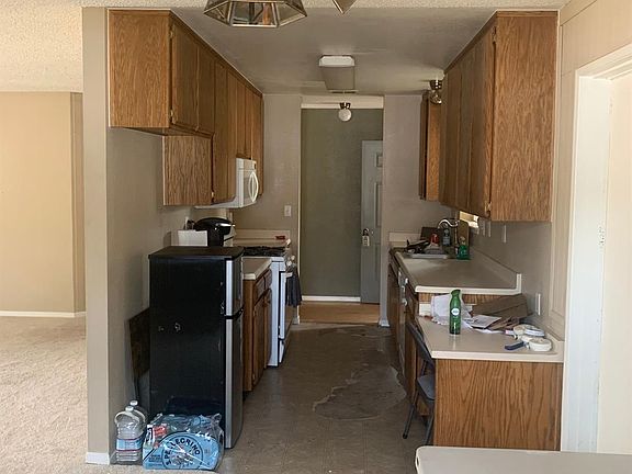 Galley style kitchen with lots of cabinets and formica counters. The flooring is pealing up and needs replaced. The living room is large size and very open has fireplace. All bedrooms are off the hallway. Master has ceiling fan and full bathroom. Laundry is in garage. house on a good size lot and has nice views. solar is about $100.00 per month and the balance owed is $16,500 agent has not verified amounts. Buyer to assume lease and monthly payments.