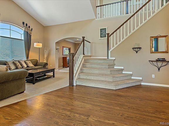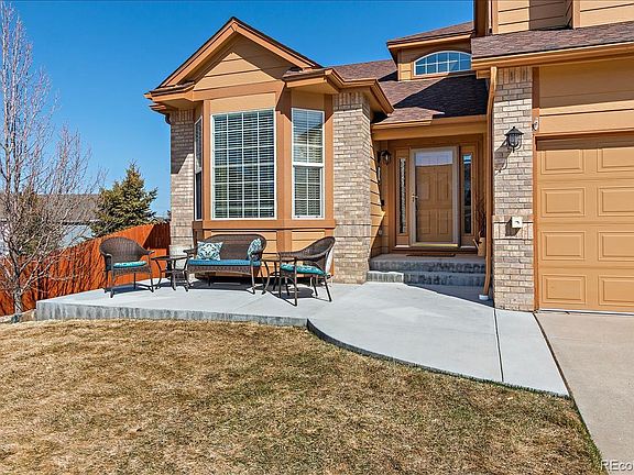 Lovely two-story Richmond Orion model nestled on a beautiful lot with mature trees. Large backyard with custom-built deck for entertaining or just sipping coffee while watching the sunrise. Home has an open feel with vaulted ceilings and plenty of windows throughout. Nice floor plan features cozy family room with fireplace and built-in shelving. Graciously sized kitchen with lots of cabinetry, island, breakfast bar, desk, and eating nook. New hardwood floors in the entryway and the kitchen. Also features a roomy main-level office (or den), freshly painted powder bath, large laundry room, and ample-sized formal family and dining rooms. Upstairs you will find a spacious master bedroom with five-piece bathroom and walk-in closet. The master is accompanied by three additional bedrooms: one with en suite two other bedrooms connected by a Jack-and-Jill bath. The basement is finished and full of daylight, with recreation area, three-quarter bath, bedroom, large space for office or game room. Great storage space. Well-maintained home! Close to throughfares, pool, parks, downtown Parker, shops and restaurants, and Black Bear Golf course.