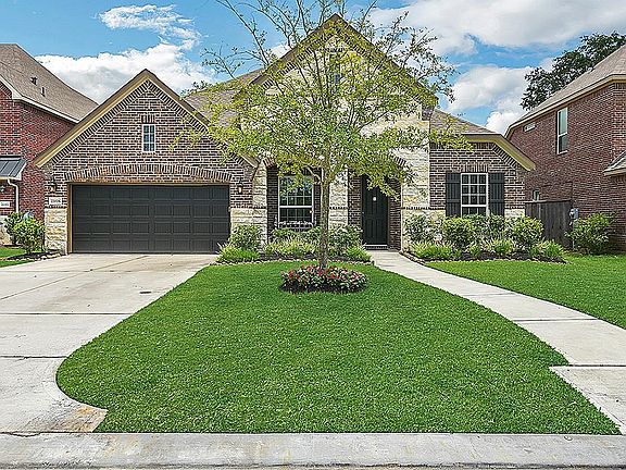Beautiful stone and brick one-story home, perfect for entertaining! Study and formal dining. Expansive living room with gas log fireplace. Cook's dream kitchen overlooks the living room and boasts granite countertops, ss appliances with double oven and gas cooktop, pantry, breakfast bar and eating nook. Private master suite with sitting area; his-and-hers vanities, soaking tub and oversized shower. Spacious secondary bedrooms. Covered patio with built-in grill leads private, lush backyard.