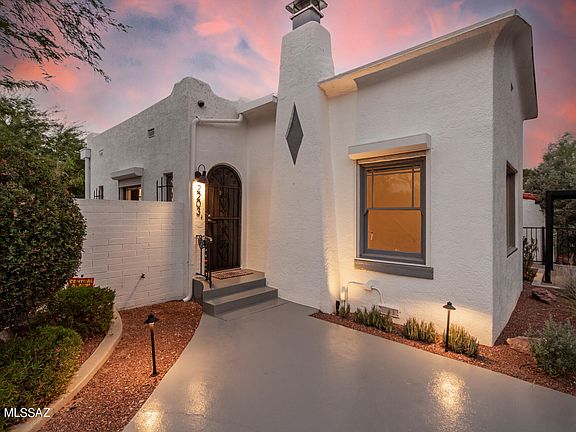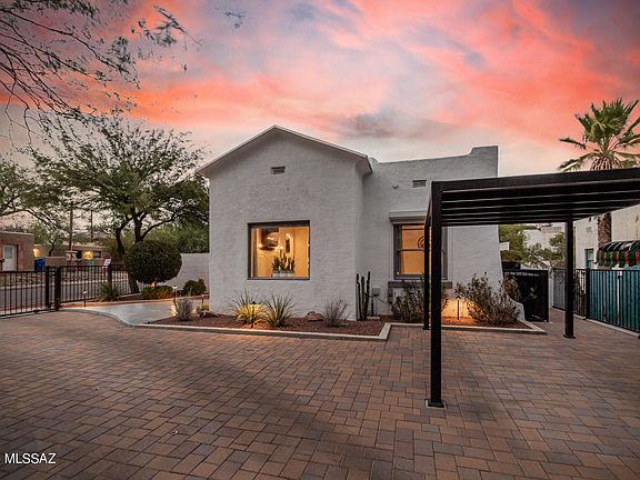Immerse yourself in the timeless allure of this exquisitely renovated 1926 Sam Hughes gem, where historic charm seamlessly intertwines with modern sophistication. This captivating residence boasts a total of three bedrooms and two full bathrooms, including the added luxury of a private guest house, perfect for hosting distinguished visitors or creating a serene home office retreat. Step into the heart of the home, where the updated eat-in kitchen beckons culinary enthusiasts with its gas-fired stove, stainless appliances, concealed microwave, and collapsable windows which provide open-air access to poolside high top table. The kitchen's piece de resistance? Unique countertops crafted from recycled paper, paired with a matching table that whispers of eco-conscious elegance. The primary bedroom, a sanctuary of tranquility, features a walk-in closet with custom-built shelving and clothes racks, ensuring your wardrobe remains as impeccable as your taste. Indulge in the luxurious dual-head walk-in shower in the main bathroom, where granite countertops and exquisite tiling elevate your daily ritual to spa-like heights. Outdoor living reaches new pinnacles with an in-ground pool, concrete patio, and integrated lighting that transforms your backyard into a magical oasis. Entertain guests around the natural gas-fired BBQ and fire pit, all while basking under the shade of a stylish metal pergola. Tech-savvy features abound, from the whole-house mesh high-speed WiFi to the Central Alarm system with cameras, and smart TVs adorning key living spaces. The circular driveway, complete with pavers and motorized gates, adds a touch of grandeur to your arrival home. Energy efficiency meets environmental consciousness with this TEP GoSolar Home, offering a fixed monthly energy bill without the need for rooftop panels. The recently replaced HVAC system comes with a transferrable warranty, ensuring your comfort for years to come. Nestled in the coveted Sam Hughes neighborhood, this home is a stone's throw from the vibrant University of Arizona campus and the verdant Himmel Park. Embrace the opportunity to own a piece of Tucson's history while enjoying the benefits of modern living - truly, a home where past and present dance in perfect harmony. Eligible for City of Tucson Historic Home Property Tax Incentives.