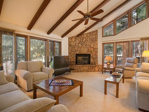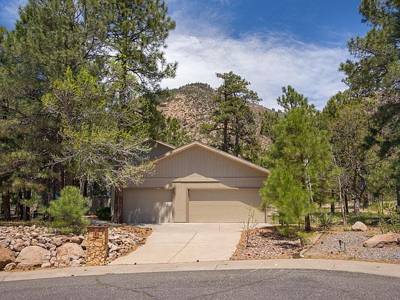 LOCATION, LOCATION LOCATION! This 3B/2B single level custom home with 3 car garage borders Forest Service and is situated at the end of the cul-de-sac. Gaze into the forest and at Mt Elden through the walls of windows in the living room and dining room. Features include the living room with vaulted ceilings, ceiling fan and a native stone fireplace, kitchen with all appliances, master bedroom with native stone fireplace, walk in closet, custom shutters, and spacious bath with separate shower and oversized tub. Other features include a large entertaining deck (replaced in 2013), central air, new roof (2013), south facing driveway and sunscreens on the west side. This home is immaculate and move in ready. You will not be disappointed!!