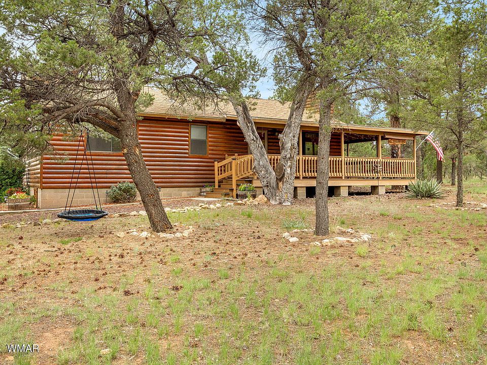 Fantastic cabin with log siding awaits! This cabin is being sold fully furnished minus a few personal items. Just bring your toothbrush and start enjoying the cool mountain air. This retreat boasts a fully covered wrap-around deck, low maintenance Trex decking, 1.1-Acre lot, detached garage with 2-car slab for parking, newly refurbished water heater, and so much more! The backyard is fully fenced for pets and kids. Enjoy the quiet cul-de-sac, large pine covered lot, and nobody behind you. This cozy cabin has all the space you need to begin enjoying your getaway!