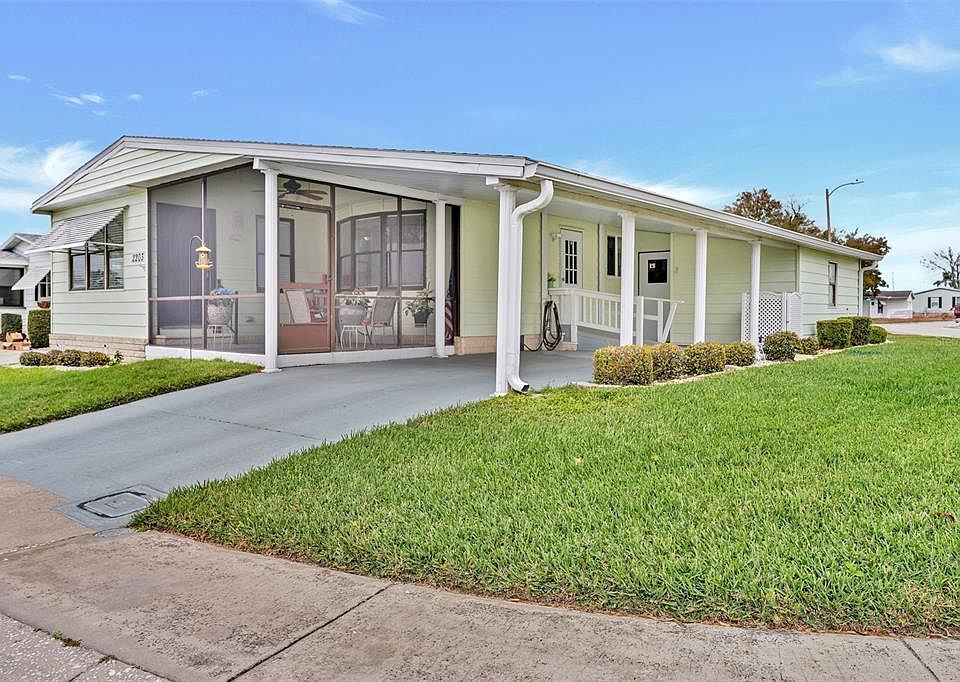 Now's your chance to own an affordable home in a beautiful over 55 golf community. As you enter the home from a screen enclosed porch, you'll be in a wonderful bonus room that can be anything you want . . . card room, crafts, office, reading room, etc. From there you enter an open space with the living room, dining room & kitchen. Very spacious and roomy - great for entertaining. Beautiful laminate floors throughout the house. Kitchen & baths are vinyl. There is much new in the house: the roof was replaced 2022, AC in 2021, and hot water also 2021. Washer & Dryer are houses in it's own little room - just off the VERY long carport. You'll want to see this house quickly. You get lots of house for a very reasonable price!