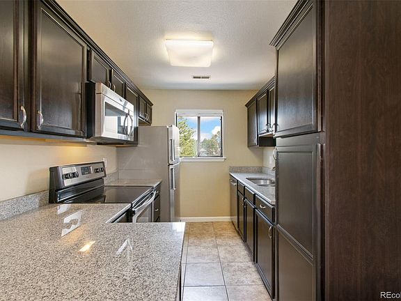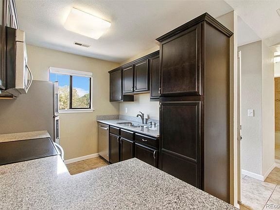 Welcome home to this updated condo in central Aurora! This 2 bed / 2 bath penthouse unit features an open layout & extensive updates throughout including tile flooring, renovated baths & updated kitchen. Home cooks will love the slab granite counters, espresso cabinetry, SS appliances & inviting breakfast bar. Cozy up by the fireplace on cool Colorado evenings or enjoy relaxing on the private balcony overlooking lush open space in the summer months. 2 large bedrooms with ample storage space. Front load high efficiency laundry in-unit & 1 covered parking spots included. The low HOA includes a community pool & clubhouse. Ideally located within walking distance to open space, trails, Horseshoe Park and only minutes from neighborhood schools, public transportation, shopping & dining. This property will not last long, book your showing today!