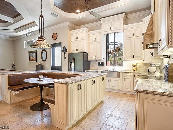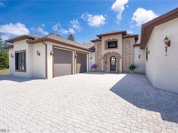 Custom Built Courtyard style home on a freshwater canal with all the bells & whistles you could ever imagine! Enter through antique wooden church doors to the outdoor courtyard area, featuring stone pavers throughout & tall wooden gable ceilings. A truly unique living area perfect for entertaining!! The screened swimming pool is pushed back maximizing the courtyard area & offering unobstructed views of the freshwater canal! The main home has 15ft tall ceilings with triple crown molding & custom wood inlays in the ceiling. This 4 bedroom, 3 bath home is 3400sqft with beautiful travertine stone throughout. The kitchen offers 2 ROWS OF CABINETS, upgraded appliances, walk-in pantry loaded with outlets, breakfast booth seating area, pot filler, large farm sink, granite countertops, the list goes on!! Master & bathroom have views of the water out every window! Beautiful guest suite w/ full kitchen, its own entrance and own AC unit. One garage space has been converted into a craft room but can be converted back easily. Cape Coral has been voted one of the top vacation destinations making this house a fantastic income producing property!