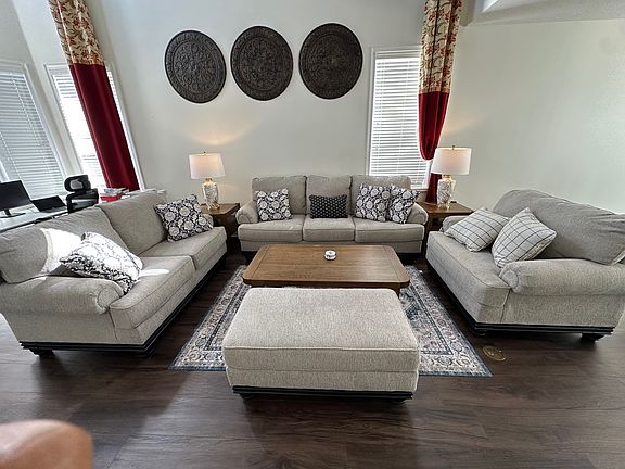 The open concept living area is adorned with brand new stylish furnishings and tasteful decor, creating an inviting ambiance that perfectly complements the natural beauty of Providence Golf Community.
