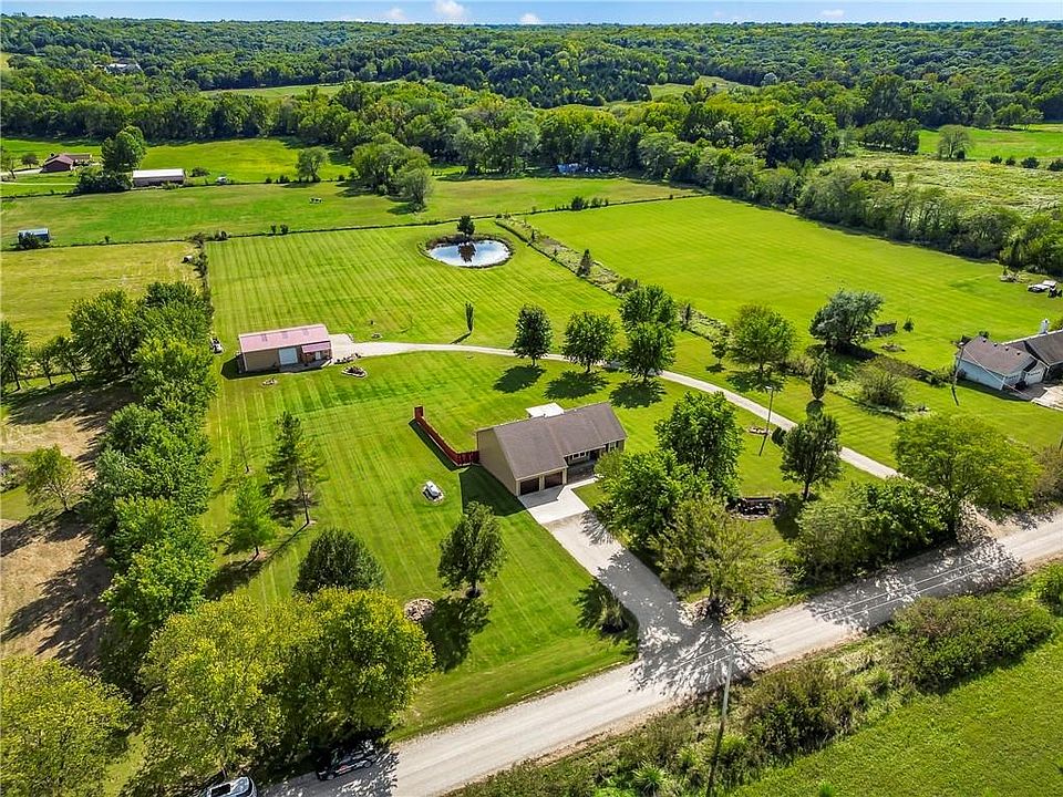 Seize the opportunity to acquire this exceptional one owner ranch home set on 5 pristine acres. Meticulously maintained, this home leaves no detail overlooked. The interior features three bedrooms on the main floor, two full bathrooms, and a laundry area within an open floor plan that includes the kitchen and living room. The lower level provides an additional family room, a cozy nook, and a fully equipped bar/entertaining kitchenette with two closets, a half bath, and generous space for hosting guests or converting into an in-law suite. Step out from the basement to a magnificent backyard with a covered porch, perfect for installing your hot tub or above-ground pool. Revel in the scenic views outdoors. Additionally, the property boasts a 30x50x12 outbuilding/shop with two 10x10 doors, featuring 5-inch concrete floors with a drain, its own propane heater, electricity, and frost-free water access. Delight in fishing at the pond or watching sunsets from the screened-in back porch and make this stunning home yours. Located 8 mins outside of Tonganoxie city limits, you are close enough to amenities but far enough for country feel seclusion.