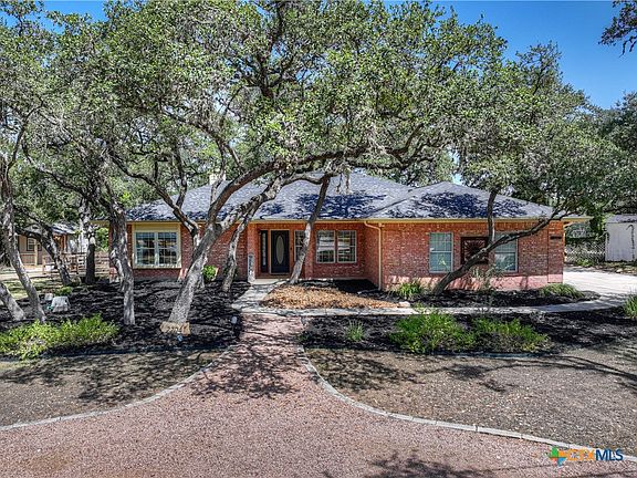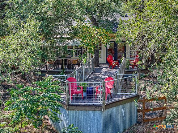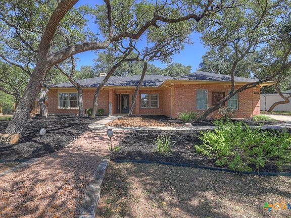 This custom brick home in the Estates of San Marcos is set on a one-acre lot that backs directly to the City’s protected Purgatory Park green space, with Purgatory Creek running across the back of the property. The natural drop in the terrain creates long Hill Country sunset views and enhances the sense of privacy. A canopy of mature oak trees shades the expansive, level deck, which offers multiple seating areas designed for gatherings, outdoor dining, or simply enjoying the quiet park-like surroundings. The home takes advantage of its setting with windows across the back, bringing in views from the living, dining, and sunroom spaces. The open layout allows the large living area to be arranged in different ways, with room for two living and two dining areas if desired. A brick fireplace with custom built-ins serves as the centerpiece, with a propane connection providing warmth and ambiance without the upkeep of a traditional wood-burning fire. Two patios have been enclosed to create sunrooms, adding flexible space for year-round enjoyment. The primary suite includes a trayed ceiling, walk-in closet, soaking tub, separate shower, and direct access to both a sunroom and the deck. Secondary bedrooms are set apart from the primary for privacy, and a dedicated office offers convenience for remote work or study. Recent upgrades include new 30-year shingles and an aerobic septic system. The property also features a newer 8x10 storage building, a greenhouse, and an RV plug. Located on a quiet cul-de-sac in a well-maintained neighborhood, this home combines thoughtful updates on the custom design, and a setting that is difficult to find—acreage, privacy, and Hill Country views, all within minutes of Downtown San Marcos and Texas State University, with low county property tax rates and no HOA.
