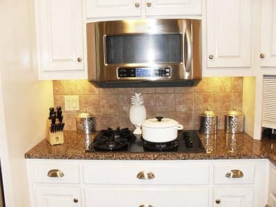 Gorgeous entrance, leaded glass front door, unique plan, smooth ceilings--various heights,treys, arches. Updated kitchen, granite, stainless appliances, newly painted, new light fixtures. Fireplace w/gas logs, built-in bookshelves, wired for sound at front door. Cov back porch overlooking scenic pool, landscaped backyard, brick fence, Dbl wrought iron gate. Dbl garage, sep workshop/garage, sprinkler sys. Pineapples atop brick fence don't stay. New roof in '07. Breakfast light doesn't stay.