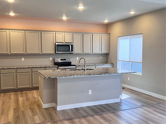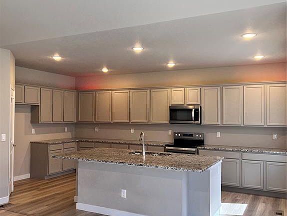 Welcome to this beautifully maintained ranch-style home in the Crestview Hills community, featuring vaulted ceilings, an open floor plan, and modern finishes throughout. The inviting 13' x 8' entryway leads into a bright living area that flows seamlessly into the kitchen and dining space, perfect for everyday living and entertaining. The kitchen includes elegant quartz countertops, a large island with a double sink, recessed lighting, and a spacious walk-in pantry. Luxury vinyl plank flooring adds warmth and durability through the main living areas, while the bedrooms offer cozy carpet underfoot. The primary suite features a double-sink vanity, two walk-in showers, and a generous closet. Two additional bedrooms and a full bath provide flexible space for guests, an office, or hobbies. Additional features include a tankless water heater, central air, and an automatic sprinkler system. The attached two-car garage is equipped with a 220V outlet for electric vehicle charging. Outside, enjoy a fully fenced backyard with a level lawn and open feel, plus easy-care xeriscaping in front with artificial turf for year-round curb appeal.