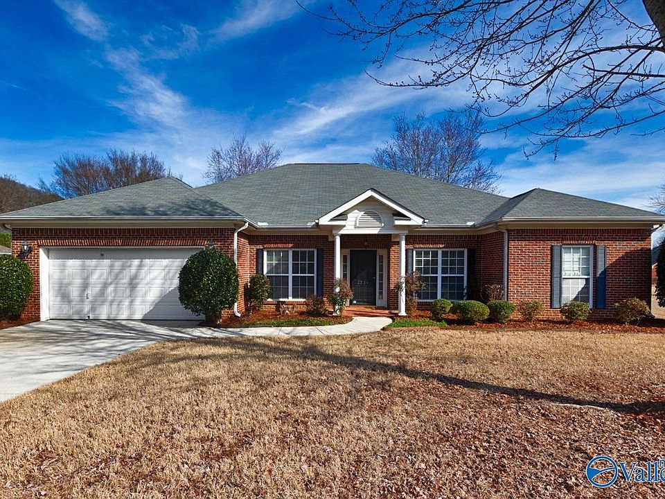 This charming brick rancher, situated on nearly 1/2 acre, boasts a thoughtful open concept floor plan. As you step inside, you'll notice new luxury vinyl plank flooring throughout the main living areas and soaring 12 ft ceilings. The interior has been freshly painted with new carpet in the bedrooms and study as well. The isolated primary suite offers a glamour bath and walk-in closet. The study/flex room plus an additional three secondary bedrooms make this an ideal floor plan. Relax on your covered patio and enjoy the spacious backyard and mountain views. Blue ribbon schools. Convenient to downtown entertainment, Jones Valley shopping, Redstone Arsenal and Lake Guntersville.