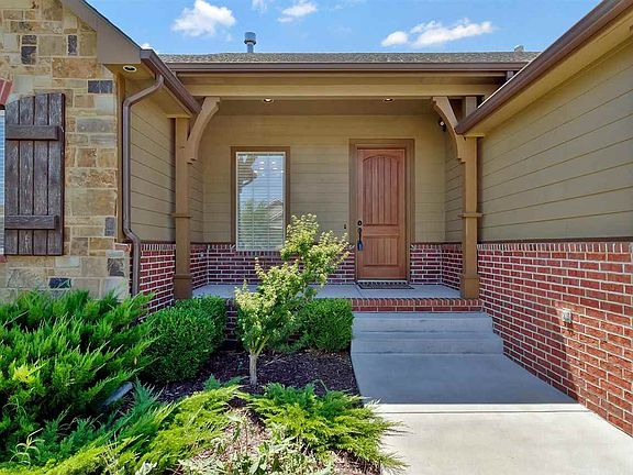 Immaculate one owner split bedroom ranch shows like brand new! This former Ritchie model sits on a cul-de-sac lot and doesn't back to other homes. The well appointed floor plan is ideal for entertaining and everyday living with spacious rooms, a large foyer, an open kitchen, high ceilings and a viewout basement. Windows spanning the back of the home allow for panoramic views of the backyard and an abundance of southern sun exposure. Enjoy fantastic curb appeal, a covered front porch, gorgeous woodwork, two stone fireplaces, wide plank hardwoods, slab granite, beautiful light fixtures, neutral decor, plantation shutters, security system wiring and a three car garage. The gourmet kitchen is the heart of this home and well suited for any cook with a large center island/eating bar, hidden walk in pantry, stainless steel appliances, decorative vent hood, under and above cabinet lighting and abundant cabinetry. Adjacent to the kitchen is a back hallway with a bench, hooks and cubbies and a separate laundry room connecting to the master bedroom closet. Retreat to a lovely master suite with vaulted ceilings, wood beams, large windows overlooking the backyard, two vanities, soaker tub, separate shower, private toilet and a large walk-in closet. Entertaining is made easy in a large basement complete with a stone fireplace, beautiful wet bar and bonus room, ideal for an office space or future wine cellar. There's opportunity for finishing two more bedrooms and an additional bathroom. They are almost completely framed out and the tub/shower is already installed! Extend your living space outdoors in a beautiful backyard with a large covered deck, concrete patio and a sprinkler system. Boasting exquisite finishes in the Andover School District within Sedgwick County, this stunning home has it all! Don't miss!
