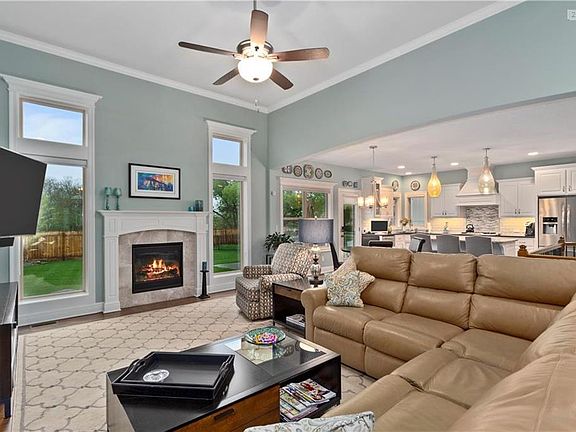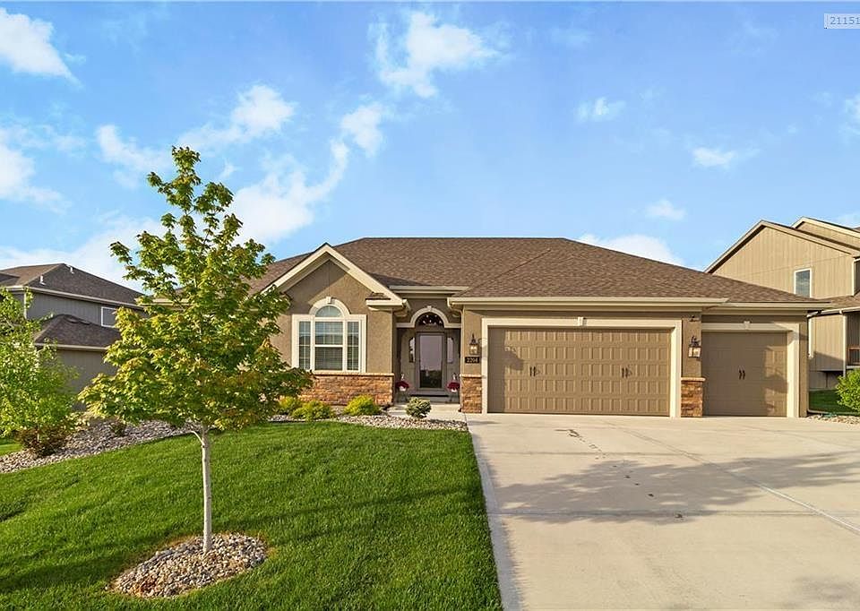 Beautiful True Ranch by New Mark Homes. Just over 2 years old, oversized covered patio, private fully landscaped yard. Open floor plan custom upgraded lighting through-out, 3 bedrooms on main level. Rec room with 4th bedroom, wet bar and possible 5th bedroom on lower level. Custom blinds throughout home. Enjoy the wonderful amenities of Staley Hills community - pool, walking trails. 10 minutes to KCI. Seller to provide Home Warranty, New HWH.