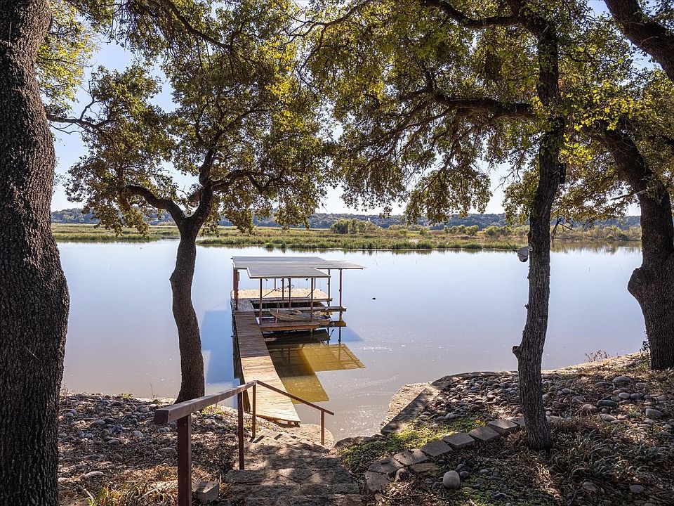 Main body waterfront home located minutes from the Granbury Square and outside the city limits in a quiet, private neighborhood with NO HOA. Features a large living room, newly refinished hardwood floors, stone see-through fireplace, and a perfect floor plan for entertaining with a second living area. The kitchen has bar seating, breakfast area and stainless appliances. Oversized master bedroom with seating area overlooking lake and ensuite bath. Extra bedrooms are complete with large walk-in closets. Back yard is a great place for entertaining with covered patio, built-in grill and then continues out to a rock fireplace. The highlight of the property is the lake front view with your own private dock. Recent upgrades and updates include: HVAC system in 2022, recently painted wainscoting in second living area, lift motor at boat dock, extended boat dock roof & cover, pump for water sprinkler at boat dock, yard sprinkler control system, added hand rail at steps to dock.