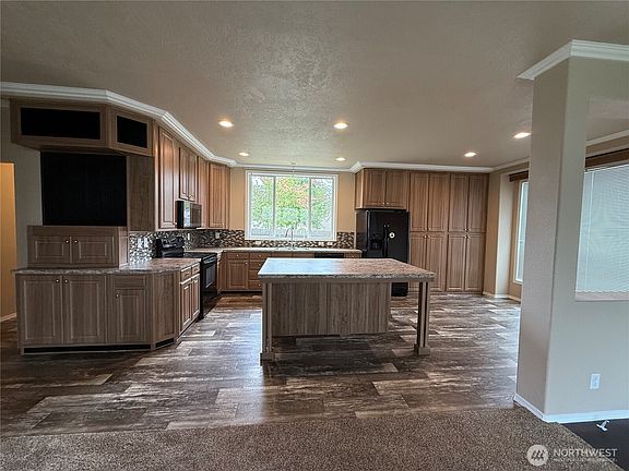 Beautifully updated home with 9' ceilings, new flooring, fresh paint, and large windows for tons of natural light. The spacious kitchen features a large island with seating, abundant cabinet storage, a message center with chalkboard, and a built-in charging station. Enjoy custom entertainment built-ins and a luxurious primary suite with a 5-piece bath, soaking tub, 5' shower, and walk-in closet. Prime location—just 3 blocks to the Transit Center, 1 block to Steel Lake Park, and 4 blocks to The Commons Shopping Center. Move-in ready and full of modern comfort! 2020 Manufactured Home secured to foundation on owned LAND - No space rent / No HOAs!