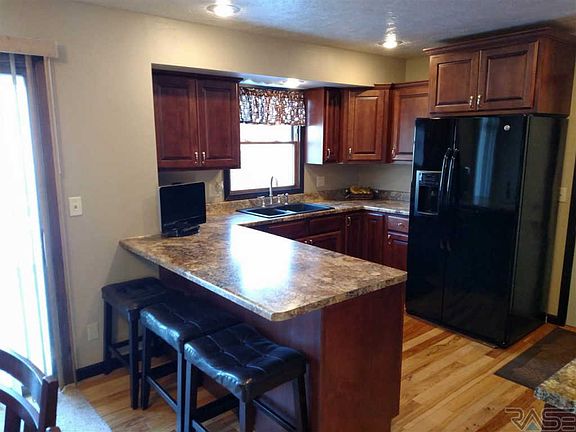 East side multi-level home with new hickory hardwood flooring on the main level. Enjoy the updated kitchen with Maple cabinets, a breakfast bar and the dining area. Three bedrooms with double closets and two baths on the upper level. Lower level has family room with fireplace and an office. Basement level has the 4th bedroom with a double closet. Lots of additional storage in the home. Relax on the nice sized deck off the dining area. The backyard is fenced and also a storage shed. Also new furnace 2011, new A/C 2014, new roof 2014, New gutters and garage door in 2016. Close to Harvey Dunn Elementary.