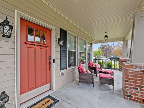 Welcome to this stunning custom-built bungalow nestled in the heart of historic New Bern. This home offers a blend of charm and modern convenience with its beautifully landscaped front and back yards. Enjoy the changing seasons from the oversized front patio or the partially-covered patio in the backyard, which blooms with tulips, gladiolus, dahlias, and hydrangeas throughout the year. Inside, you'll find this home is adorned with elegant trim details throughout. The living room features coffered ceilings and a cozy fireplace with gas logs. Beadboard wainscoting and crown molding set the stage for gracious entertaining in the dining room. Magnificent cook's kitchen boasts granite counters, glass-front cabinetry, gas stove and large stainless farm-style sink. Indulge in the luxurious primary suite with walk-in closet and two separate vanities in the bath. Not a bit of space is wasted in this floorplan, with a dedicated office space and a cozy den off the back of the home that has a stylish shiplap wall. Additional features include double sinks in the guest bathroom, generously-sized closets, custom window treatments, upgraded ceiling fans and light fixtures, and a Rinnai on-demand hot water heater. The backyard also features an upgraded workshop/shed with windows and electricity. All this and it is located just minutes from all the shopping and restaurants in historic downtown New Bern. Don't miss the opportunity to own this exquisite home with its exceptional blend of character and comfort.