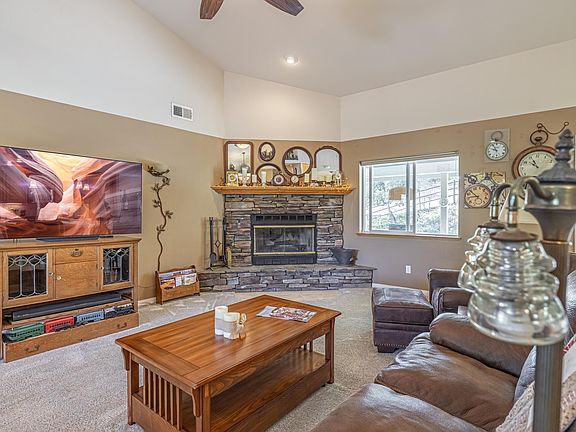 TURN KEY Golden Hills single story home located at the end of a cul-de-sac, set back far from the road...granting you the peace and tranquility you desire so close to town.The front landscaping invites you into an adorable covered front porch with a view of the surrounding mountains and trees. The interior of the home offers a split wing floorplan with an entry way, great room with a centralized fireplace, open updated kitchen with a large bar and dining area. There are two large bedrooms with a shared bathroom on the north side of the home and a well appointed master with en-suite on the south side of the home with private backyard patio access, perfect for a hot tub or a private lounging area.The backyard is ready for entertaining with a covered patio, lush landscaping and a large garden shed. The property is fenced and cross fenced for your furry friends and boasts just under an acre of usable land with fully accessible RV parking with 30 amp hookups. All of this on natural gas!