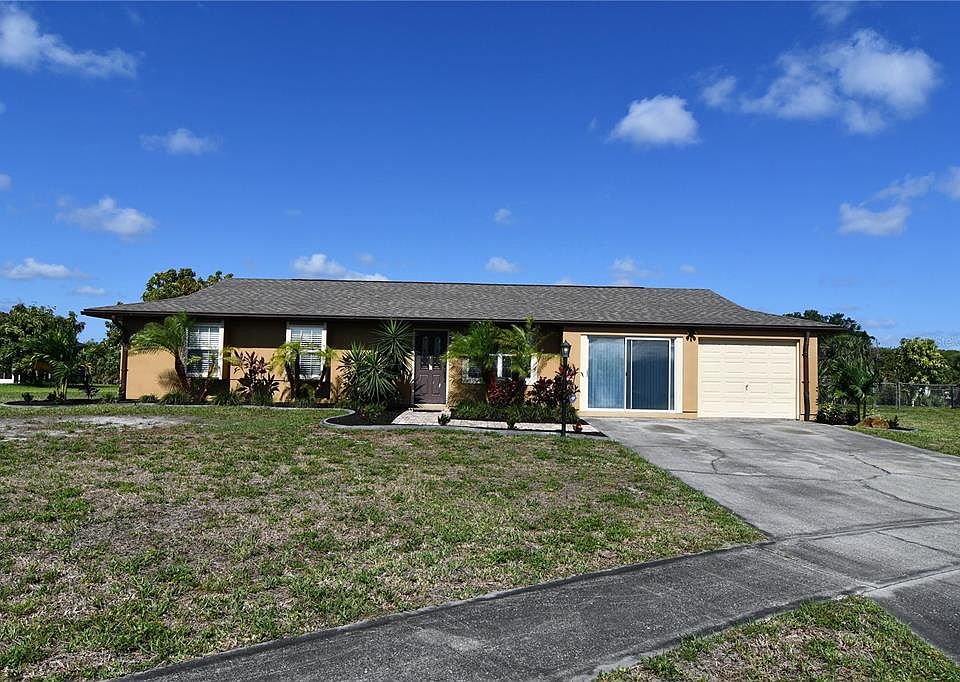 Multiple offers, highest and best by 2pm, 5/16. Situated on intersecting canals that overlook the Port Charlotte Golf Course, this lovely 3-bedroom 2-bathroom home with attached garage is situated on the corner of a cul-de-sac in a quiet neighborhood that allows for waterfront living at a very affordable price. The moment you walk in the front door you are greeted with a beautiful view of the canal behind the home, which can be seen through the windows and slider of the expansive family room just off the dining room. The spacious living/dining area with tiled flooring throughout, flows effortlessly into the kitchen area featuring Corian countertops, pantry closet and stainless-steel appliances. The master bedroom has wood laminate floor, slider to the backyard and master bath with large walk-in shower and single sink granite top vanity. The guest bedrooms are sure to please family and friends and have wood laminate flooring. The guest bath has tiled full bath and large granite vanity. There is a patio area in the backyard where you can sit out and enjoy the canal front and plenty of room to add a pool with lanai. Home also features new roof 2020, freshly landscaped yard, ADT alarm system, single car garage with laundry and storage area, 18x12 storage shed with electric. The centralized location gives you the benefit of quiet waterfront living while still allowing fast access to the city's shopping areas, schools, Port Charlotte Golf Club, beaches, I-75 and more. Call today to book a showing while it's still available!