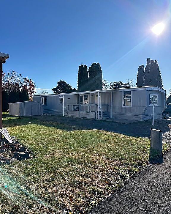 Situated in Skyline Estate, a family and pet friendly park, this home is move in ready. Freshly painted inside and out, it also has new flooring throughout, new kitchen cabinets and counters and a new furnace to keep you warm this winter. The open living, dining and kitchen has large windows which fill the room with natural light. The master bedroom features a large walk-in closet and spacious bathroom with a walk-in shower and lighted vanity. A second bedroom is on the opposite end of the house. In the main bathroom, there is a bathtub with shower and a linen closet for storage. For your outdoor living, there is a covered porch with ample room for seating, a large storage shed and lawn. Park's lot rent is $870 per month. Buyers will also have to meet Park qualifications i.e., financial qualifications and background check. For more information about their qualifications contact the park manager at 509-452-4382,