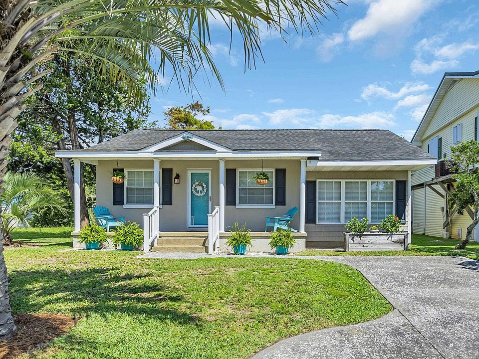 Well cared for beach home in a great location just a few blocks to the beach in the Cherry Grove section in North Myrtle Beach. This has been a family home for many years with great curb appeal, tropical landscaping, nice yard, covered back patio, out building, outdoor shower, front porch, stucco and vinyl shake siding, replacement windows, LVP & Tile flooring, renovated kitchen, Quartz countertops, updated cabinets, tile backsplash, kitchen island, crown molding, fully furnished with nice furniture, beachy décor, renovated bathroom, tiled walk-in showers with glass doors, updated doors, fireplace, murphy bed for additional sleeping options, storage space, washer/dryer, and nice fans and fixtures. Great home in an amazing location with easy access to restaurants, shopping, entertainment, and the beach!