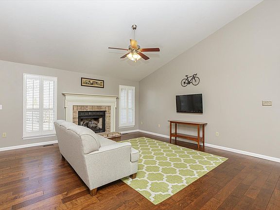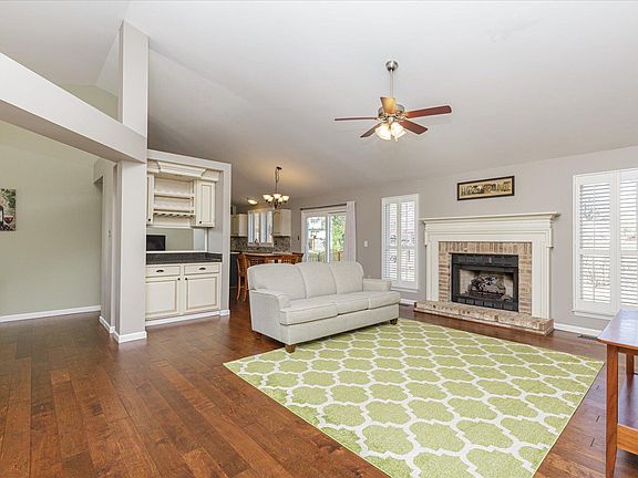 Impressive, 3 BD, 2 BA, 1864 s/f ranch in the desirable Twin Chimneys neighborhood! Fall in love with the curb appeal w/brick façade, arch shingles, coach lights, enclosed fascia/soffits and a large covered front porch. Features inc a large Grt Rm, vltd clngs, beverage center, eng wood floors, 3 bdrms plus an Office/Flex Rm, DR, plantation shutters, FP w/cust mantle, brick surround and gas insert, granite counter tops and backsplash, SS appl, island, main flr laundry, 6 pnl doors, bay window in the Master, sep shower/soaking tub in the Master Bath, dbl bowl vanity w/dressing table, high effic furnace, humidifier, 16 SEER A/C and more. Walk out of the Brkfst Rm to a cust stamped patio, firepit and level, fenced yard. There is easy access to Hwys 364 and 40/61, schools, shopping, restaurants and services. Enjoy community amenities inc clubhouse, pools, lakes, walking trls, multi game courts and playground. Desirable Fort Zum schools. Beautiful home, amazing community, fantastic location! COOL: 14 SEER+