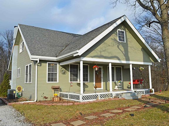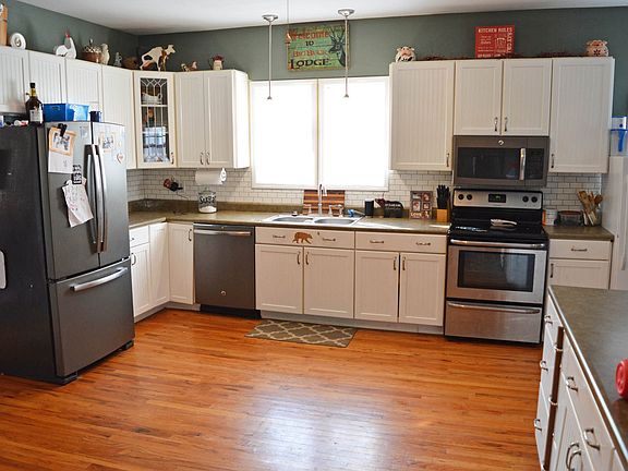 Open & spacious with farmhouse feel! Excellent floor plan in this 1916 1.5 story. Hardwood floors, open staircase. Huge renovated kitchen w/ lots of cabinets & light. Kitchen appliances all negotiable. Large full bath & laundry rm on 1st floor. 3 bedrooms upstairs, master has walk-in closet. 1.58 acres, beautiful wooded view from sun porch. Sun porch has pellet stove. Detached garage, nice yard & deck. Covered front porch.