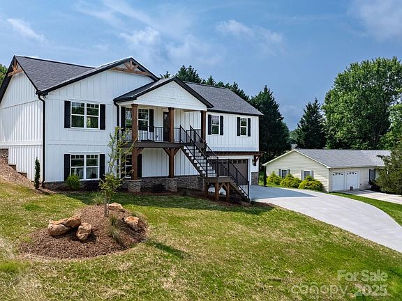 Beautifully crafted new construction overlooks the picturesque western NC Mountains. The two-car garage provides access to the basement level, featuring an open living space, kitchenette, and bath adorned with genuine hardwoods throughout. The main floor boasts remarkably high ceilings with added beams. The open kitchen to family room concept is impressive, with access to the back deck, front porch, and lower level. The split floorplan offers a perfect layout, with the spacious master suite, complete with a full bath and ample closet space, situated opposite three additional bedrooms and one full bath.