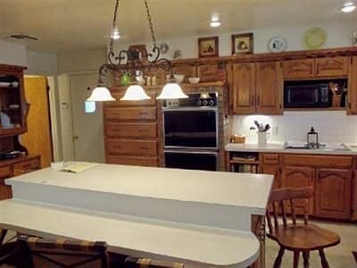 This home is the modern day "Ponderosa". It has it all. Like new interior with multiple upgrades including new fold-out thermopane windows, plush carpet, 4 car garage plus a 24 x 30 steel insulated workshop, large storage building in back and pole barn for the horses. Situated on approximately. 4 acres. 2 3/4 baths, beautiful kitchen and wide open floor plan. 4 ton high energy efficient heat pump made by Lennox with humidifier. Dry inground storm cellar. Hail resistant roof shingles. Won't last long.