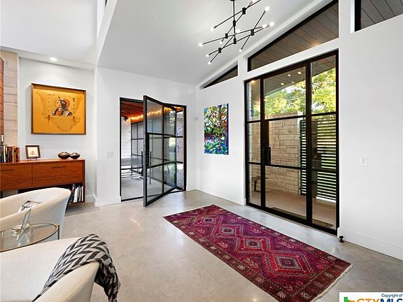 Stunning hill country modern dog trot home. Enter through the steel & glass front door, and view the Blanco River thru a glass wall. Home features open floor plan, starting w/island kitchen adorned w/quartz & wood waterfall countertop, Wolf appliances, butlers pantry, & custom cabinets. The living rm includes fireplace & floating Bubinga wood cabinets. Dining is beautifully illuminated by Hubbardton Forge chandelier. Primary suite offers stunning views & a spa-like bathroom. Connected to kitchen is a sitting/bedroom & guest bathrm featuring a pecan countertop. Step through a pivoting steel door into the screened dog trot entertaining area. Space is equipped with an outdoor kitchen & bar featuring a pecan countertop. Guest quarters consist of 2 ensuite bedrms w/separate sitting rooms, divided by a media rm. At the back of the house, you'll find a spacious covered patio w/hot tub. There's convenient access to the River. Float, paddle board, or kayak, &enjoy the cool water. 3 car garage.