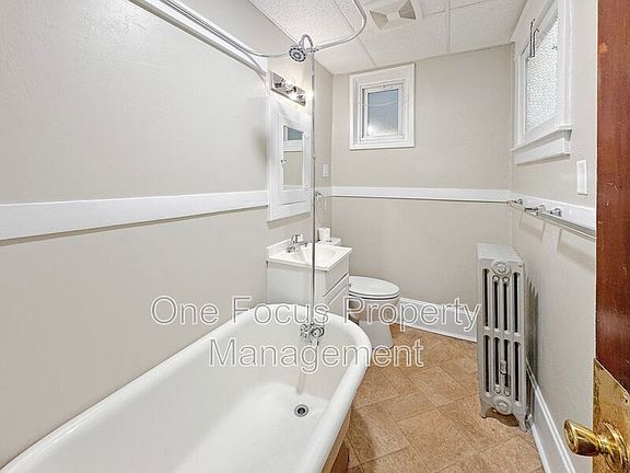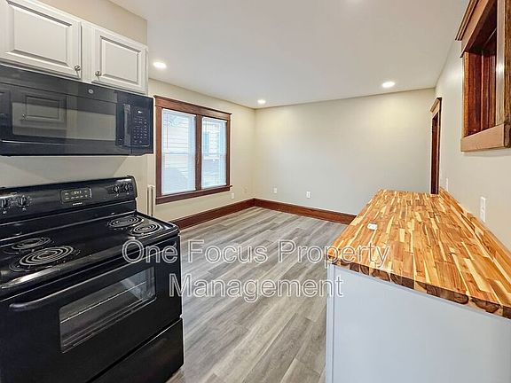 This second-floor apartment is a real stunner. When you walk inside the home, you are greeted by a large kitchen and dining space. This area is accented with modern cabinets and a decadent matching banquet, accented perfectly with a butcher block countertop. There is also a large space that would be well-suited for a dining table and chair set. Each bedroom is large enough for a king bed and a dresser, and the living room can easily accommodate larger furniture. The bathroom is as cute as a button with a fun vintage bathtub and neutral tones. Tenants are responsible for electricity, water, sewer, and natural gas for the water heater only. Natural gas heat, lawn care, and snow removal are also included in the cost of the rent. Heat Source: Natural Gas (Included) Appliances Included: Fridge, Stove, Microwave. Laundry: Coin-operated in the basement. Parking: 1 assigned space only. Street parking will be needed for additional vehicles. Minimum Application requirements: Minimum of a 600 credit score 2.5 times the rent in verifiable income after debt services Bank account verification. Pet friendly! 1 cat allowed. The monthly pet rent for each pet is based on the FIDO score indicated on your pet screening profile after completion. 5 paws: $35.00/month, 4 paws: $40.00/month, 3 paws: $50.00 per month. CAGED AND TANKED ANIMALS DO NOT REQUIRE A PET APPLICATION BUT WILL BE SUBJECT TO A $15/MONTH FEE. All leases signed with One Focus Property Management include the following fees that are not included in the cost of the listed rent: A one-time $50 move-in fee. $15/month Resident benefit program fee. $12.95/month master renters insurance policy. Do not submit any application for this home with or pay any fees or deposits to any party other than One Focus Property Management. Amenities: 1 cat welcome