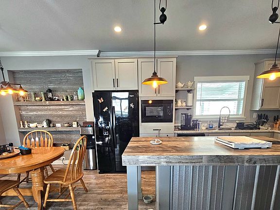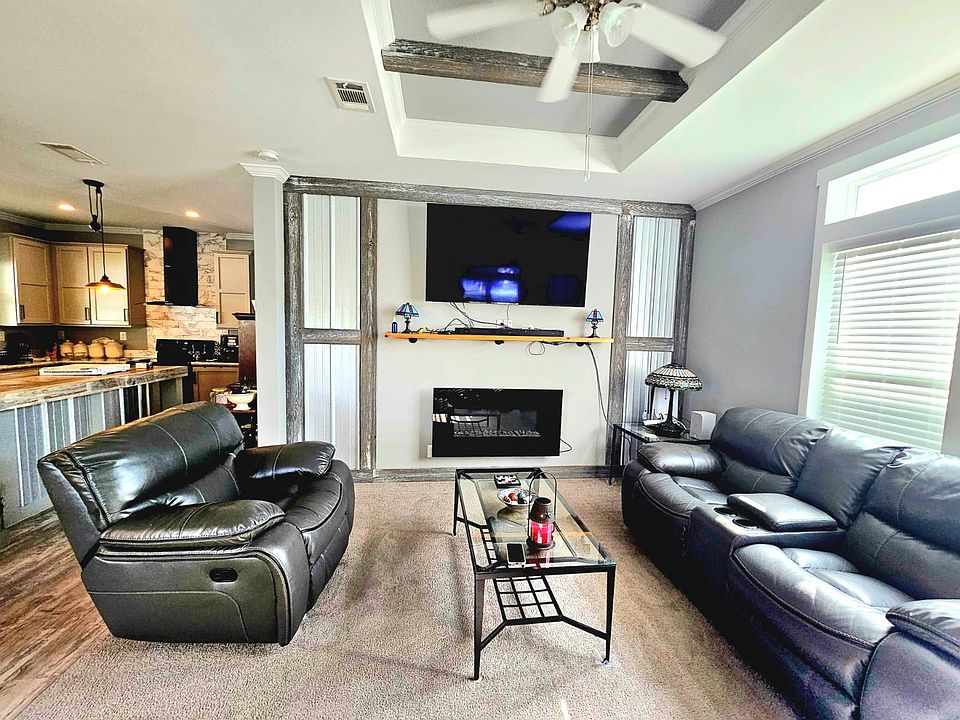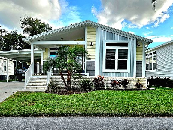 This 2020 farmhouse in Cypress Lakes Village offers 2 bedrooms, 2 baths, a den, and over 1,500 square feet. Located in an active 55+ community on leased land, the Craftsman-style porch provides a relaxing spot outdoors. The open living area and kitchen feature wood and metal accents, shaker cabinets, floating shelves, Corian counters, an island, and modern lighting. Crown molding, double-pane windows, trey ceiling, and a wall-mounted fireplace add character. The den, accessed via barn doors, doubles as an office. The primary suite has a double vanity, walk-in shower, and closet; the guest bath separates it from a spacious guest room. Additional amenities include a laundry room, shed, and a large carport. Quality finishes are highlighted throughout the home. The roof and AC unit are 2020 models. The home is offered unfurnished. Buyers do not own the land and must pass a background, credit, and financial check. Residents pay a monthly fee ranging from $1100.00 and up, and age restrictions apply. Fees include access to pools, hot tubs, a fitness center, tennis courts, bocce ball, pickleball, horseshoes, clubhouse, and an onsite Bar & Grill with daily specials and entertainment. Lawn mowing, biweekly trash pickup, and a 24-hour staffed guard gate are also included. The community offers two 18-hole golf courses with membership or 'pay as you play' options. All listing information is reliable but not guaranteed and should be verified through the community manager regarding current rates and associated cost.