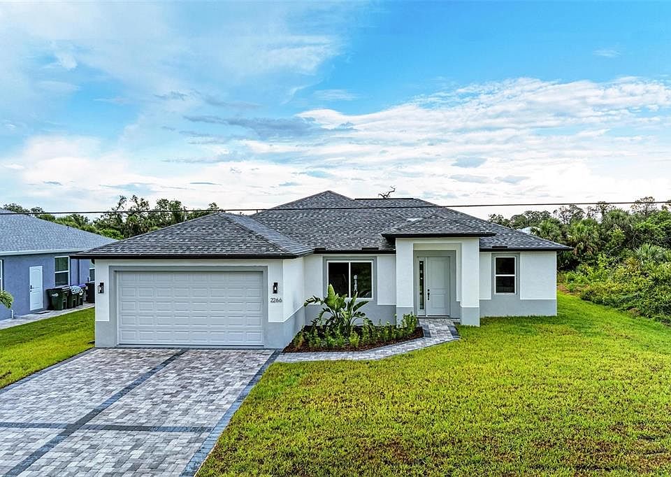 One or more photo(s) has been virtually staged. New construction modern home nestled in a mature, established neighborhood with no HOA. Enjoy a spacious lanai, modern features, high ceilings, tile and laminate flooring, and luxury finishes. A stunning kitchen features stainless steel appliances, modern fixtures, counters, and an oversized island. The master retreat offers a walk-in closet, standing shower, dual vanities, and lanai access. The split floor plan provides privacy for guests. A flex space can be used as a den, office, or sitting area. Hurricane impact windows protect the home. Outside, gorgeous landscaping has been custom-chosen, taking advantage of the Florida sunshine and offering plenty of privacy. 3 homes are available on this street.