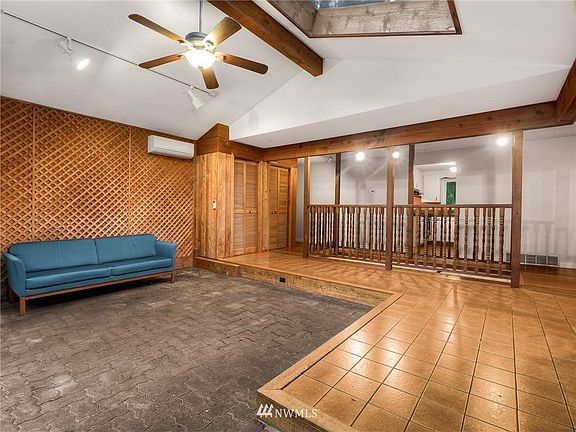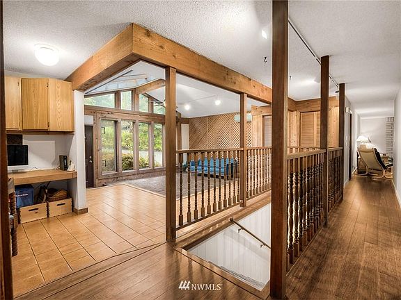Fantastic neighborhood on quiet tree lined street! Natural light, exposed Cedar vaulted ceilings, stone floors. 1 story w/finished downstairs incl. 2 beds, 2 baths per floor. Built in office w/upper cabinets. Perfect for study, work from home! Downstairs bdrm w/fp, french doors, great private suite or set up guests, rental, in home biz. Oversized lot, mature landscaping, terraced gardens, sprinkler system. On demand gas ht wtr. Lakes, trails, recreation, dining, shopping, services close by!