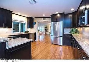 UPDATES GALORE AND ON THE LAKE! This completely updated 3 bedroom home with pool situated on the lake with southern exposure will surely impress. The spacious chef's kitchen features newer stainless steel appliances, custom kitchen cabinets and gorgeous granite counter tops. The open and bright living room opens out onto the swimming pool over looking the lake. The family room features a wood burning fireplace with new marble surround, molding above with hearth & bookshelves. Recently the seller installed new windows, new gutters, new pool heater, new light fixtures, new interior & exterior paint, new sprinkler system with rain bird controls, new tile, new carpet in bedrooms, new wood flooring, new sod for the entire yard, new lanai screening, new molding and interior doors with all new hardware. This home shows like a model and is in pristine condition. This updated lake front home is situated on one of the most preferred streets in Kings Lake, Royal Lane. Residents of Kings Lake enjoy the 3 lakes, bike/jogging path around the main lake, tennis court, and very low hoa fees. Kings Lake is only minutes to the Naples beaches and downtown 5th Ave South. Truly a MUST SEE!