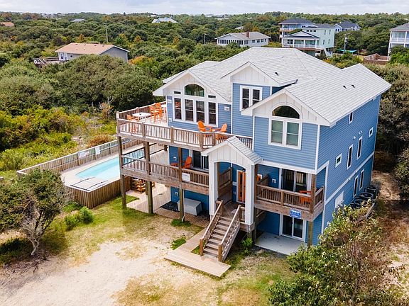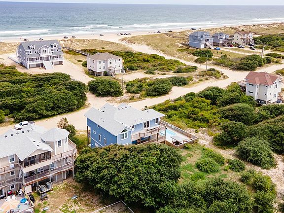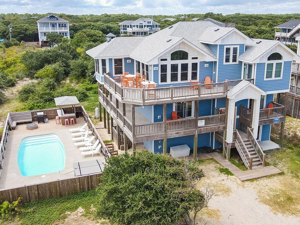 “Du South” delivers the ultimate Corolla 4x4 experience—just steps from Ramp 22 and one lot back from the beach with sweeping ocean views. This stunning 9-bedroom, 9.5-bath semi-oceanfront retreat combines coastal charm with modern updates, offering plenty of space for family, friends, and rental guests. The top floor showcases an open, light-filled great room with ocean views, gas fireplace, and wraparound decking. The spacious kitchen is a showstopper, featuring quartz countertops, a large prep island, bar seating for nine, shaker cabinets, tile backsplash, stainless steel appliances, two dishwashers, wine fridge, and ample seating in kitchen/dining area to accommodate your guests. Two bedrooms on this level each offer deck access, and their own bathrooms. A crow’s nest above seats four with panoramic views. The mid-level features hardwood floors, three king ensuite bedrooms with deck access, and a twin ensuite, each with their own baths and quartz counters. A convenient half bath is located between levels two and three. The ground floor is designed for entertainment, including a large movie theatre with raised seating to provide a great viewing experience for guests, rec room with pool table, full fridge, beverage center, and direct pool access. This level also includes two bunk rooms with built-ins, a king bedroom, and additional full baths. Step outside to your private pool, hot tub, outdoor shower, gas fire pit, and tiki hut.  Enjoy the outdoors while the wild horses roam freely — an experience unique to Corolla’s 4x4 beaches.