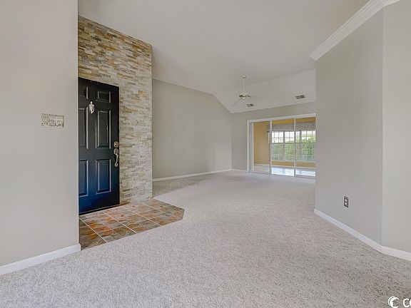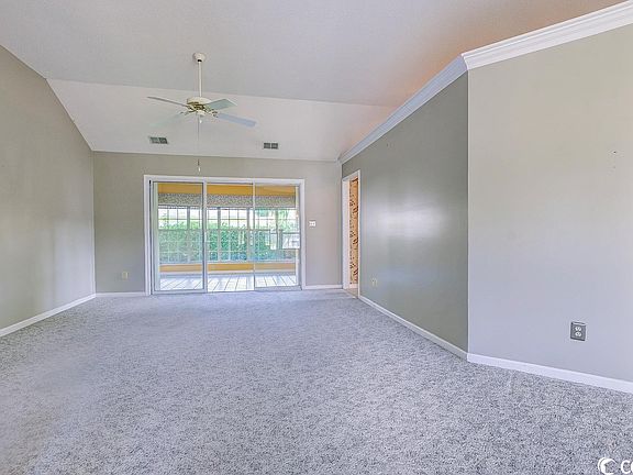 What a lovely setting for this spacious 2 bedroom, 2 bath home with oversized one car garage in the popular 55+ Woodlake Village community. Nestled among the trees on a cul-de-sac, this home has great curb appeal with nicely landscaped front yard, burgundy shutters, covered entryway with attractive black door with storm door, bay and palladium windows, and a long drive with extra parking pad. Few houses with this floor plan in Woodlake Village. This house features an open and airy plan with 9 foot and vaulted ceilings throughout. Enter the home into a tiled foyer with decorative tile wall that leads to the spacious and open living and dining room area with vaulted ceiling, carpeting and sliders leading to the fabulous Carolina Room. Family dinners are sure to be enjoyed in the adjacent dining area with a Bay window overlooking the front yard. The spacious kitchen features a bright and cheery breakfast nook with bay window, stainless steel range, dishwasher and microwave, white refrigerator, tile backsplash, ceramic tile flooring, lots of cabinets, counter space and wallpaper. Laundry room with shelving. Spacious master bedroom with vaulted ceiling, fan, carpeting and bay window overlooking the backyard. Master bath with garden tub/tiled shower, ceramic floor, newer vanity and window bringing in lots of natural light. Large guest bedroom with vaulted ceiling, fan, 2 closets and carpet. Guest bath with walk-in tiled shower and floor. The Carolina Room with windows all around, ceiling fan and views of the backyard is sure to be a favorite spot to relax or start your day with your favorite morning beverage. The large backyard patio will be a great spot for grilling, entertaining and building memories with family and friends or just relaxing and enjoying the sights and sounds of nature. Entertaining comes naturally here – it is truly your own private oasis. Oversized 1 car garage with utility sink, storage cabinets, worktable, pull down stairs leading to attic, window and door leading to the backyard. Newer HVAC (2018) and water heater (2021), irrigation system. The location, serenity and peaceful setting of this home make it one you don’t want to miss. Just a short ride to the beach and conveniently located just minutes from restaurants, shopping, hospital, entertainment, endless golf and the Murrells Inlet MarshWalk. Low HOA fees and great amenities including clubhouse, community pool, library, pickleball & shuffleboard courts and a wide variety of activities. Measurements and square footage are approximate and not guaranteed. Buyer is responsible for verification.