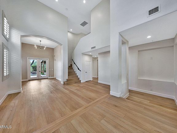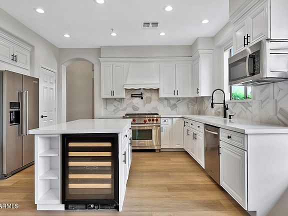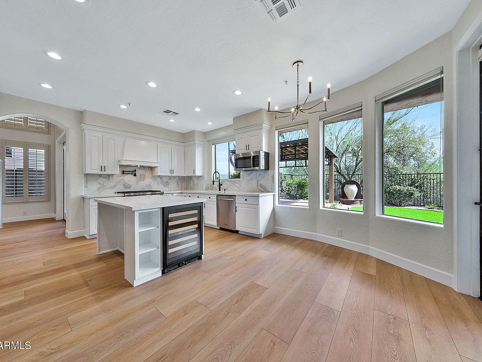 This beautifully updated residence in Sonoran Hills offers a fresh, contemporary feel with new luxury vinyl plank wood flooring, upgraded recessed lighting, and stylish fixtures throughout. The chef's kitchen is a showstopper with crisp white cabinetry, quartz countertops, a center island with beverage fridge, decorative backsplash, gas range with pot filler, stainless steel appliances, walk-in pantry, and a cozy breakfast nook. The adjoining family room features a dramatic new feature wall with large-format tile and wood soundboard accents. The grand two-story entry showcases soaring ceilings and picture windows, leading to the formal living and dining rooms. A private office or den with built-in bookshelves, a full bathroom with walk-in shower, dedicated laundry room, and direct access to a two-car garage with epoxy floors and a spacious attached storage/flex room (ideal as a home gym or workshop) complete the main level.