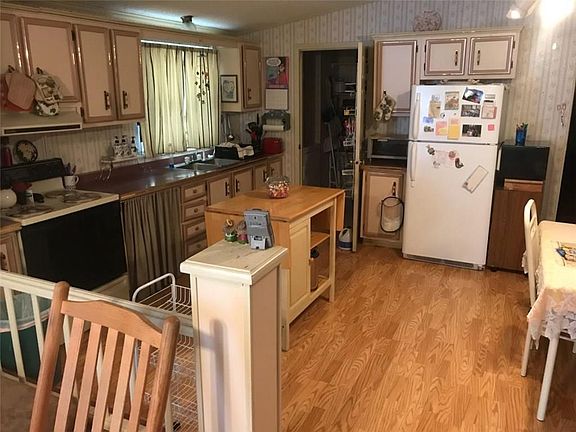 This single mobile home features laminate floors, an open kitchen and living room, and a laudry room just off the kitchen.