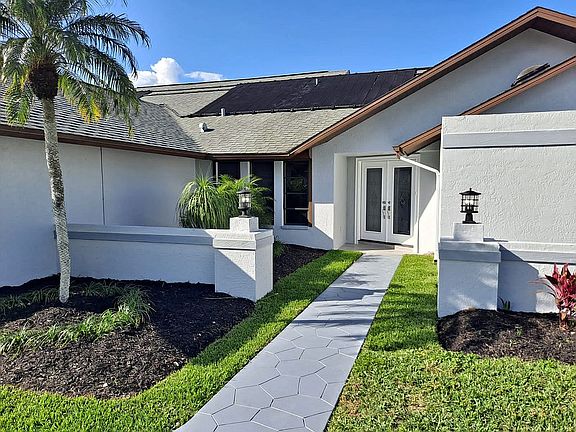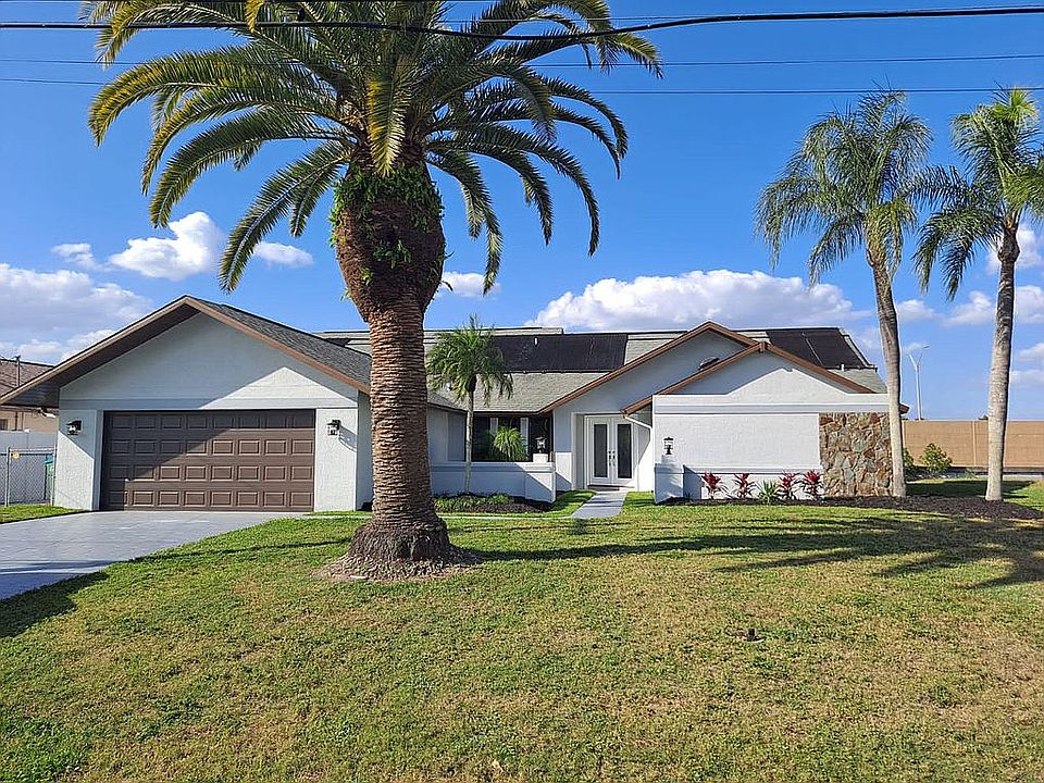 Boaters Dream Home !!Minutes From The Caloosahatchee River and Gulf Of Mexico* 4 Bed, 2 Bath, 2 Car Gar w/2,274 Sqft Living Area and Mansard Caged Solar Heated Pool * On Direct Sailboat Gulf Access Canal * Concrete and Wrap-Around Dock w/10,000 Pound Boat Lift * * Electric and Manual Storm Shutters *Completely renovated in 2021 Split floor plan Updates Incl: New AC , new modern bathrooms, indoor laundry, beautiful custom made kitchen with brand new stainless steel appliances and white quartz countertops , 32x32 porcelain floors through out and More! * * Move-In Ready.