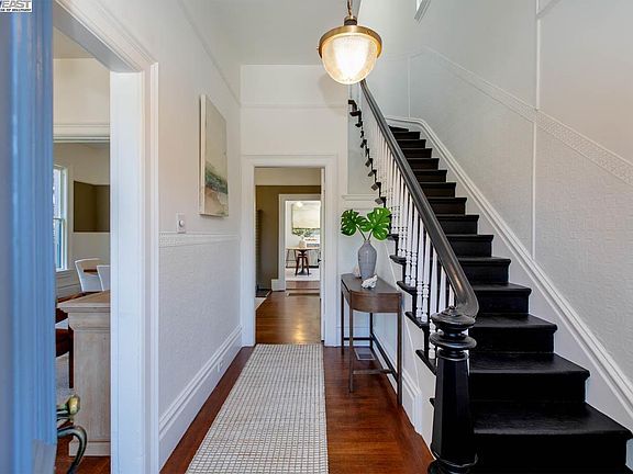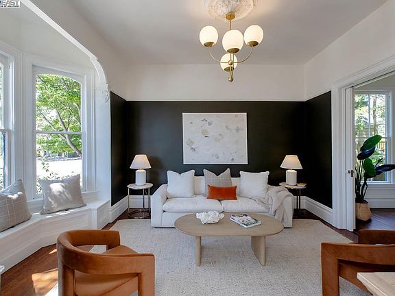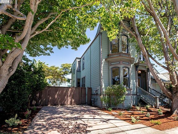 Built in 1877 (per Alameda Historical Museum), this elegant Victorian Italianate home has wonderful vintage style both inside and out! Situated on a large, private lot just 2 blocks to downtown Park St and 1 block to the Alameda Library, the home features 6 bedrooms, 2.5 bathrooms, formal living + dining rooms, a spacious updated kitchen with a walk-in pantry, a family room, laundry room and a spacious basement bonus space for storage or a home fitness area (572 SF, measured). Original architectural details include large rooms with 10-ft ceilings and carved medallions, ornate bay windows with window seats in the living room + primary bedroom, pocket doors, picture rails, and hardwood floors and oversized windows throughout. A large main floor bedroom is convenient for guests or a home office.The primary bedroom is attached to what originally must have been a nursery, now ideal for a home office, studio or library. New interior paint + light fixtures. Plenty of bright, natural light throughout. Covered back deck + a yard with a paved patio, large lawn. Off-street parking + EV charger. This prime central Alameda location is just 5 minutes to South Shore Center shopping and 3 blocks to highly ranked Alameda HS. Easy access to freeways + BART. This is vintage Alameda at its finest!