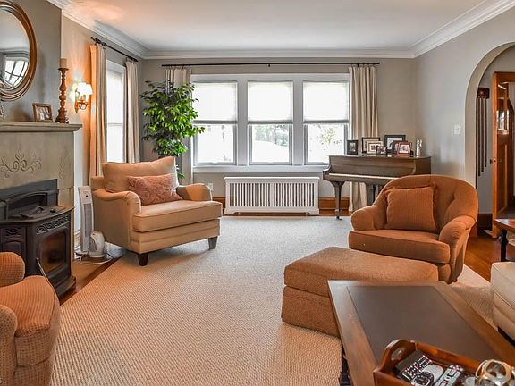 Ridgewood is akin to time travel with its breathtaking woodwork, hardwood flooring, arched entryways and stylistic charm! The grand living room boasts an elegant fireplace with the perfect atmosphere for company. Host holidays meals in the formal dining room that can easily fit an 8-seater table. Through the French doors, curl up with your favorite read in the picturesque sunroom. Prepare your favorite dishes in the updated kitchen with stainless steel appliances, granite countertops, tin backsplash and a pantry. Enjoy your morning coffee in the quaint breakfast nook with a tin ceiling and built-in cabinets. Convenient powder room on the main level. Beautiful wood flooring throughout the living, dining, sun room and all 4 bedrooms. Upstairs, there's an enormous master bedroom with a fireplace, sitting area and direct access to the updated full bath with walk-in tiled shower and garden tub. At the end of the hallway, there's a door to section of bedroom 4 for a guest suite! Complete with a full bath, 2 closets, a private balcony and its own staircase to the kitchen. The third floor is incredible! It offers 2 additional bedrooms, a bonus room and a full bath with a claw foot tub. 2-car attached garage, too. Super private backyard with a covered patio, shed and fire pit. Extras include boiler 2019, heat pump, plumbing, electrical plus newer roof and Anderson windows in 2009! Remarkable home - don't miss out!