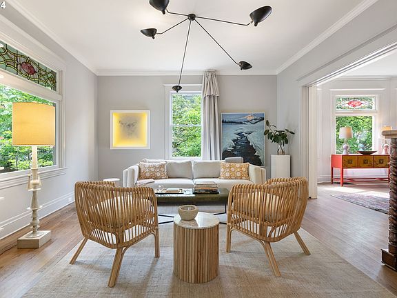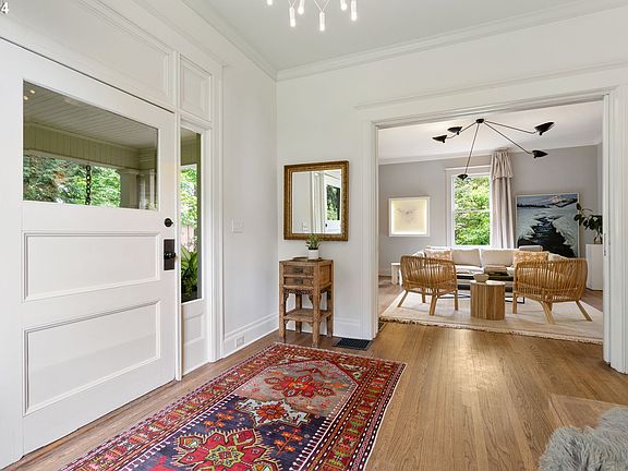 Perched above the street on a double lot in historic Irvington w/ a beautiful, natural privacy screen on all sides, sits this stunning fully-renovated home and property, equally well-suited for elegant entertaining and cozy, comfortable, everyday living. Extensively remodeled by renowned, local design-build firm, Orange, w/ emphasis on high-functioning design and exceptional flow. And, oh my, does this home ever flow! Tall ceilings, generous passageways and rooms opened up just enough to create exceptional light transfer and free, easy movement between living spaces. And the flow doesn't stop at the back door! It continues effortlessly to the fabulous private outdoor spaces. Unique, thoughtful, functional design details include: rare attached, 2-car garage entering into semi-finished basement; extra-wide stairway w/ under-rail lighting from basement into kitchen; walk-in pantry w/ convenient pet-watering station; kitchen opened to an incredibly spacious family room; wall of windows w/ wide, sliding doors from family room to deck, patio and yard; and butler's pantry w/ wet bar. Entertainer's dream kitchen w/ custom-built white oak cabinetry, honed Calcutta marble and Silestone counters, large island, gas cooktop, 2 dishwashers, big walk-in pantry and breakfast nook. Primary suite w/ large walk-in closet and en-suite bathroom w/ heated tile floors, marble-tiled steam shower, soaking tub and private water closet. Hall bathroom w/ marble tile heated floors, creatively designed to have distinct spaces for shower-bath and water closet, each w/ its own sink and vanity, separated by pocket door. Private outdoor Shangri-La includes lawn (w/ space for a pool), multiple patios, Ipe deck, raised, irrigated vegetable beds and 8-person hot-tub w/ adjacent sitting area. Updated systems include plumbing, electrical, HVAC. Double lot w/ easy potential to divide - ask agent for details. All the hard work is done! Reap the rewards of a fully renovated home in a historic neighborhood! [Home Energy Score = 1. HES Report at https://rpt.greenbuildingregistry.com/hes/OR10226363]