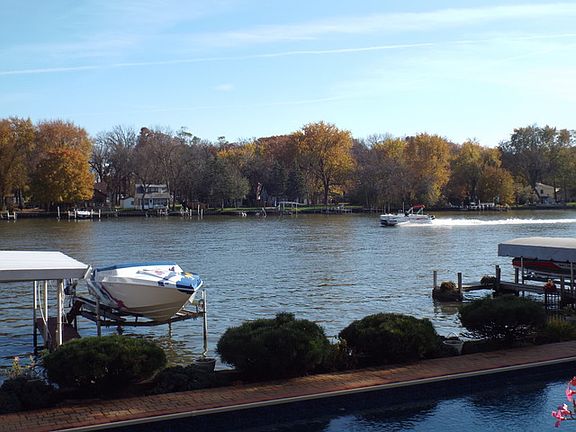 HIGH & DRY! NO FLOODING HERE! SPACIOUS CHAIN O''LAKES FOX RIVERFRONT. OAK KIT w/LRG BRKFST BAR. DR OPEN TO LR w/STONE WALL & WOOD STOVE. 2 SLIDING GLASS DOORS TO HUGE DECK, INGRND POOL w/BRICK PATIO & STEPS TO CONCRETE SEAWALL & 2 PIERS w/COVERD SLIP. 1ST FLR LNDRY & FULL BATH. LRG BDRMS, 2 w/GLASS DOORS TO RIVERFRONT BALCONY. BSMT w/EXTERIOR ACCESS. WROUGHT IRON FENCED & GATED YARD. 2CAR GAR w/STAIRS TO STORAGE LOFT.