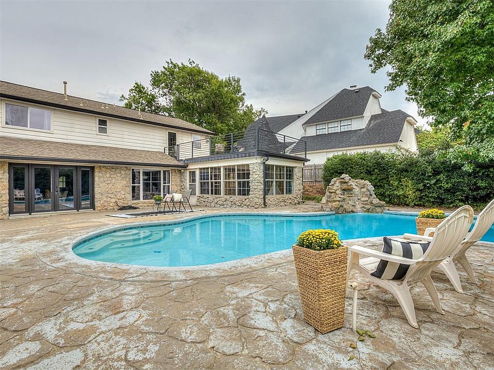 The main level features a living room with stone fireplace, formal sitting and dining rooms with original herringbone parquet floors and wood wainscoting, and a breakfast nook with pool views. The kitchen includes a farmhouse sink, granite counters, center island, and a walk-in pantry with a “Harry Potter” closet. A large laundry/mudroom is off the garage for everyday convenience.