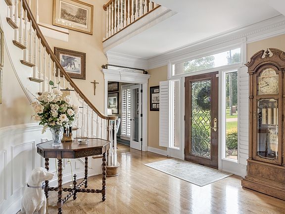 Introducing a timeless brick colonial estate that defines Southern elegance—nestled in the coveted Breckenridge community on nearly an acre of lush landscaped grounds.This grand 4-bedroom, 3.5-bath residence spans 4,791 sq ft and offers an unparalleled blend of classical architecture, refined interiors, & an extraordinary resort-style outdoor escape. A dramatic double-height foyer welcomes you with a grandiose crystal chandelier and sweeping curved staircase, setting the tone for the sophistication found throughout.Gleaming hardwoods flow into an luxurious formal dining room adorned with a gas fireplace & exquisite custom mantel, while the richly appointed study boasts custom trim, tray ceilings, & an air of distinguished charm. Designed for both culinary artistry & effortless entertaining, the gourmet kitchen is outfitted with granite countertops, custom cabinetry, a gas cooktop with double ovens, stainless steel appliances, a wine refrigerator, and a walk-in pantry with custom shelving. The open-concept layout continues into a sunny breakfast area and spacious living room with a wood-burning fireplace, all framed by expansive windows & French doors that lead into a stunning sunroom—showcasing soaring vaulted ceilings & dramatic arched windows with sweeping views of the backyard. A luxurious main-level guest suite offers flexibility for multi-generational living, while the upstairs primary suite is a sanctuary unto itself, complete with a double-tray ceiling, custom cabinetry, dual vanities, spa-like jacuzzi tub, & an oversized tiled shower. Two additional guest rooms share a beautifully appointed full bath. Outside, escape to a backyard oasis rarely seen in residential living. A newly lined saltwater pool is encircled by an elegant balustrade terrace, lush perennial flower gardens,a koi pond with a relaxing waterfall, & multiple lounging areas creating a truly private retreat. Additional features include a 2 car attached garage & a 3 car detached garage w/storage.